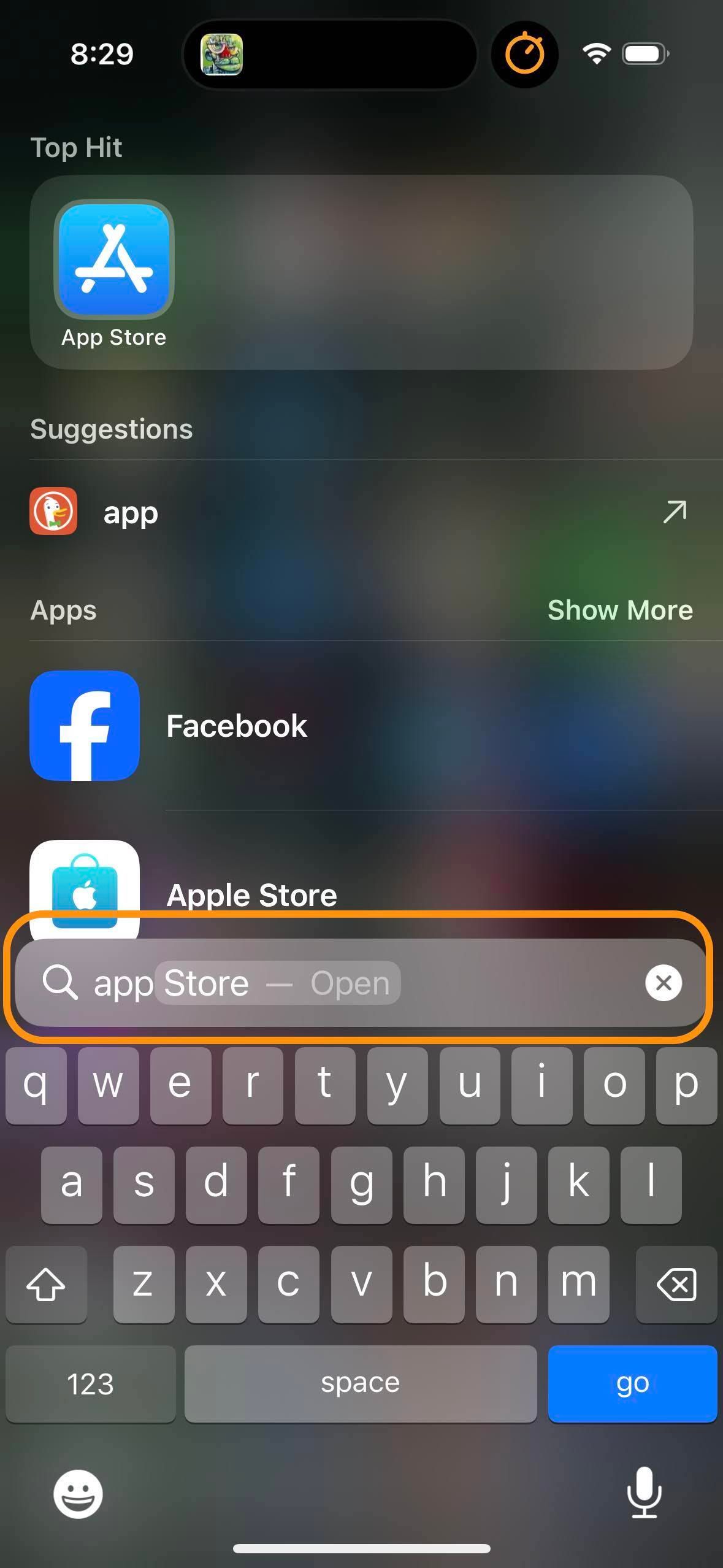 If your App doesn’t get suggested, tap the blue Search button on the keyboard.